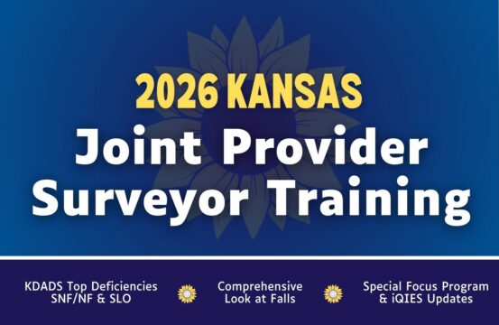 Our annual Joint Provider Surveyor Training is back on April 29 and 30 to provide your IDT teams with a full-continuum exploration and approach to falls management, along with updates from KDADS on top-cited deficiencies, the Special Focus Facility (SFF) program, and iQIES. Joint Provider will primarily feature an interactive, workshop style training, led by Lisa Thomson and Colleen Toebe with Pathway Health, and broken into four focus sessions including: